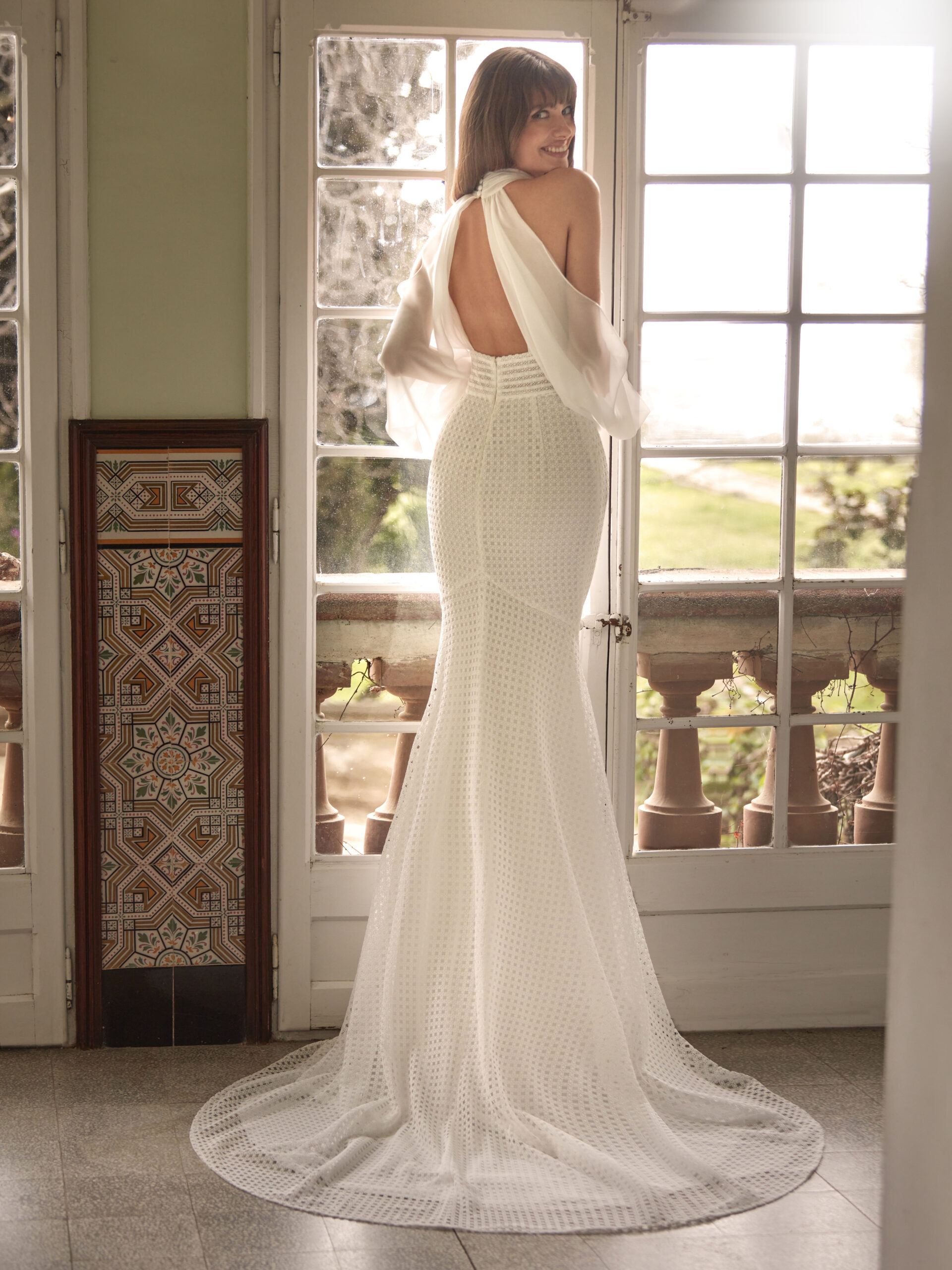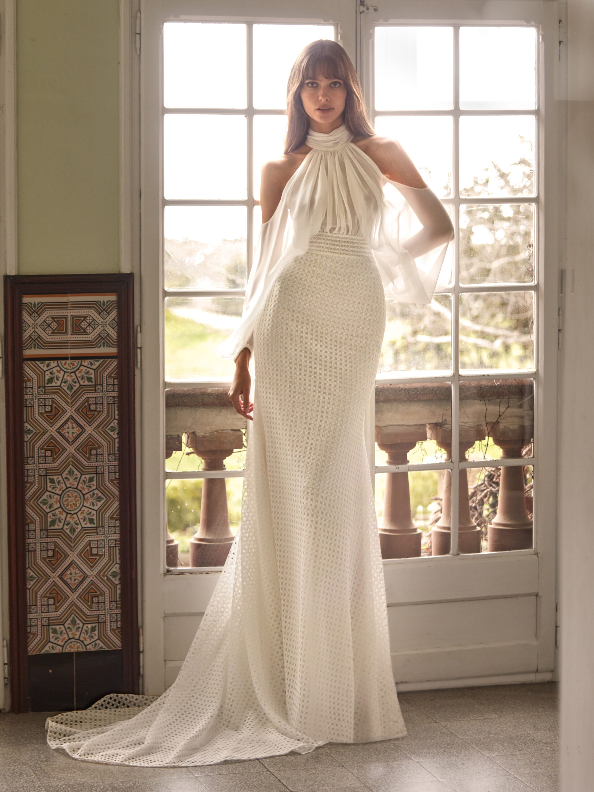With long sleeves, high neck, and semi-open back, this lace and chiffon design conveys enveloping elegance. Ideal for a bride seeking an ethereal look with character.