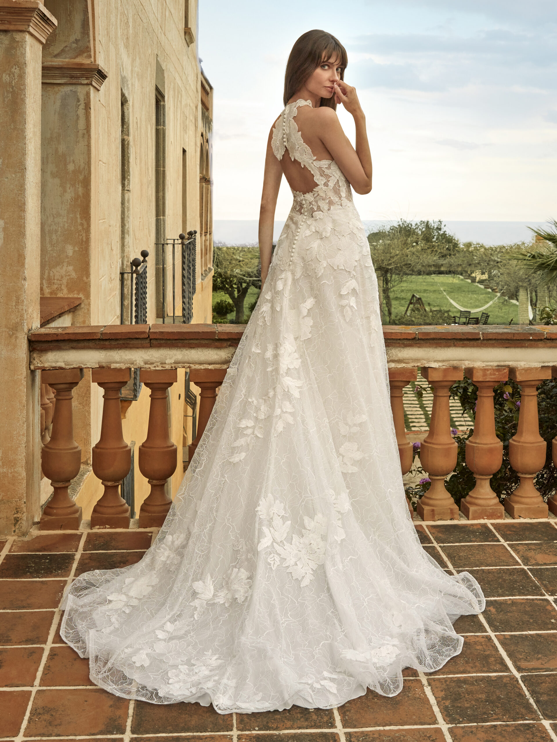 With a halter neckline and semi-open back, this lace dress redefines elegance with a modern touch. The flowing silhouette and subtle details make it an ideal choice for a bride with her own style.