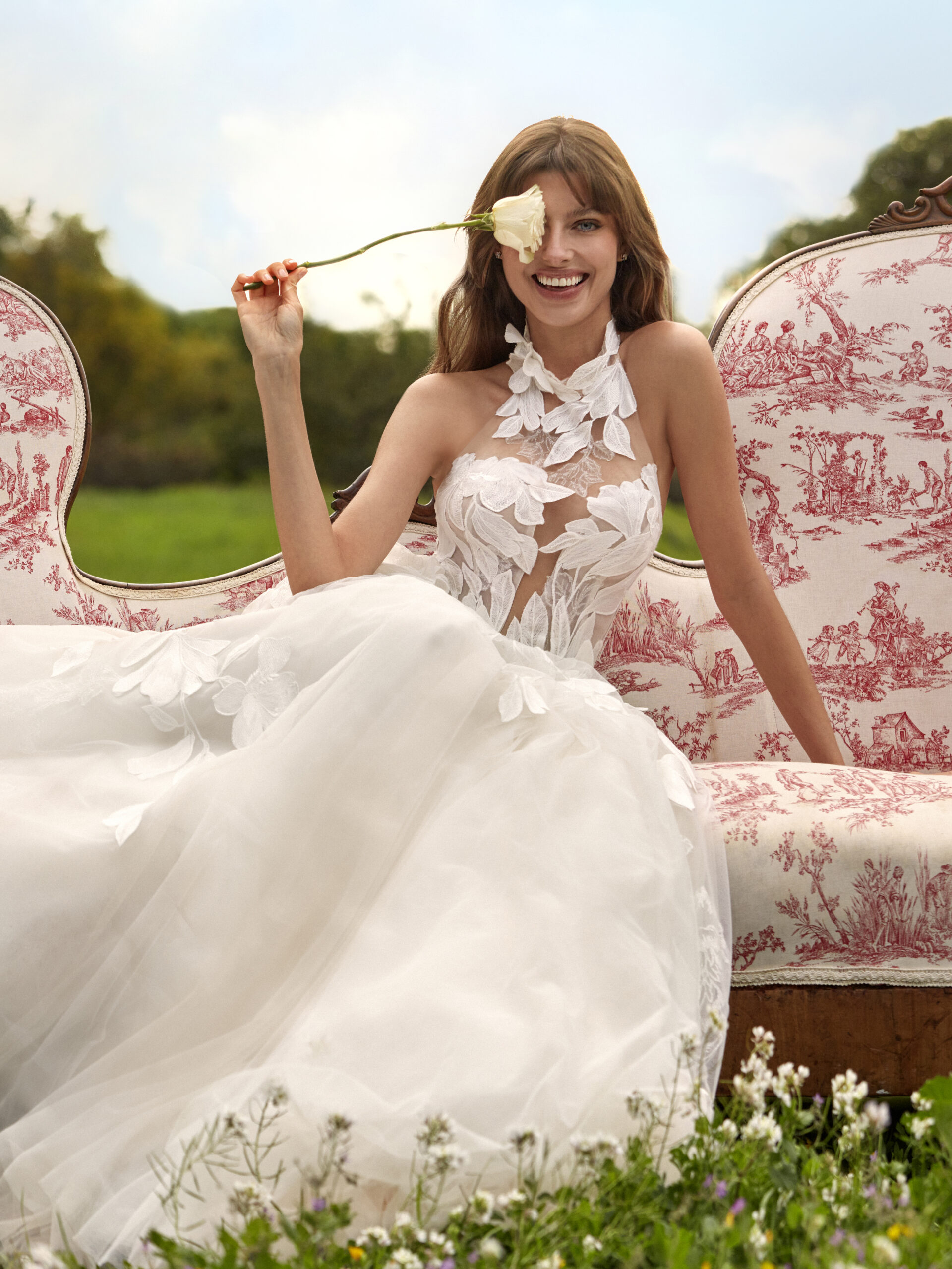 Light and charming, this halter-neck dress with an open back moves fluidly. Tulle and lace add texture and transparency, creating a fresh and elegant look.