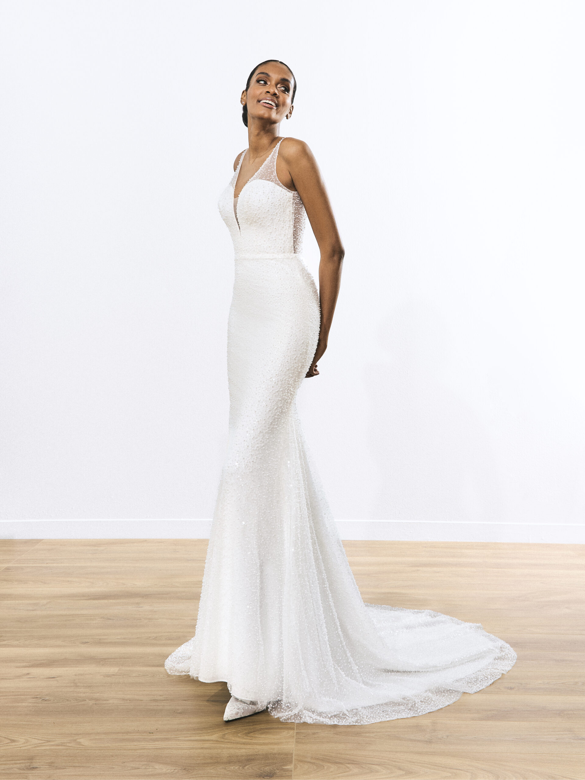 This mermaid gown in beaded tulle is pure drama. A plunging neckline and open back create a bold silhouette, while the intricate beadwork catches the light with every step.